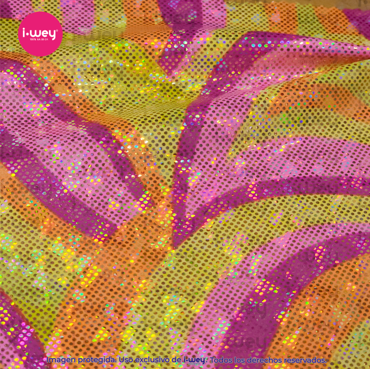 Fabricada con materiales de alta calidad, la Licra Holograma Circus ofrece excelente elasticidad, ajuste cómodo y gran durabilidad, lo que la convierte en una opción ideal para prendas que requieren movilidad y resistencia.