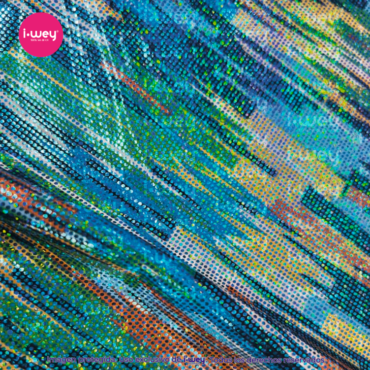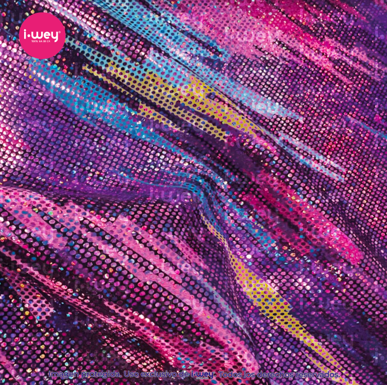 - La Licra Holograma Retro es una tela elástica con impactante acabado holográfico y diseño de líneas dinámicas combinadas con puntos tipo disco, inspirada en la estética vibrante de los años 80 y el estilo futurista. Su efecto iridiscente refleja la luz en múltiples tonalidades, creando movimiento visual y un brillo espectacular bajo iluminación natural o escénica.